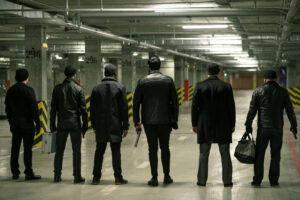 Rear view of row of criminals or gangsters in black standing on parking area In by [email protected]March 4, 2025